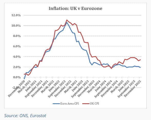 Annual CPI inflation for December was up 0.2% from the previous month at 3.4%. A rise was expected, but the Reuters’ market consensus expectation had been for 3.3%. In its December Monetary Policy Committee Minutes the Bank of England said “…Budget [measures], in combination with other news in recent CPI data and with some downward moves in sterling oil and gas futures curves since November, had led Bank staff to lower their expectation for CPI inflation to closer to 2% in 2026 Q2.”