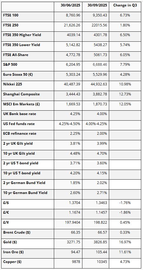 The third quarter ended with the USA once again in the spotlight. On the Friday before the month end, Donald Trump announced another round of tariffs. These included 100% on pharmaceuticals and, somewhat bizarrely, 50% (reduced to 25% by the following Tuesday) on wooden kitchen cabinets under a law designed to counter national security threats. At the end of September, the US Government entered shutdown, with Congress unable to agree a budget for the new financial year starting on 1 October. The shutdown is the first since 2018, when Trump 1.0 experienced a 35-day closure. Despite this chaotic background, global markets shrugged and carried on with business as normal. The insouciance of the markets shows up in the Q3 table below: