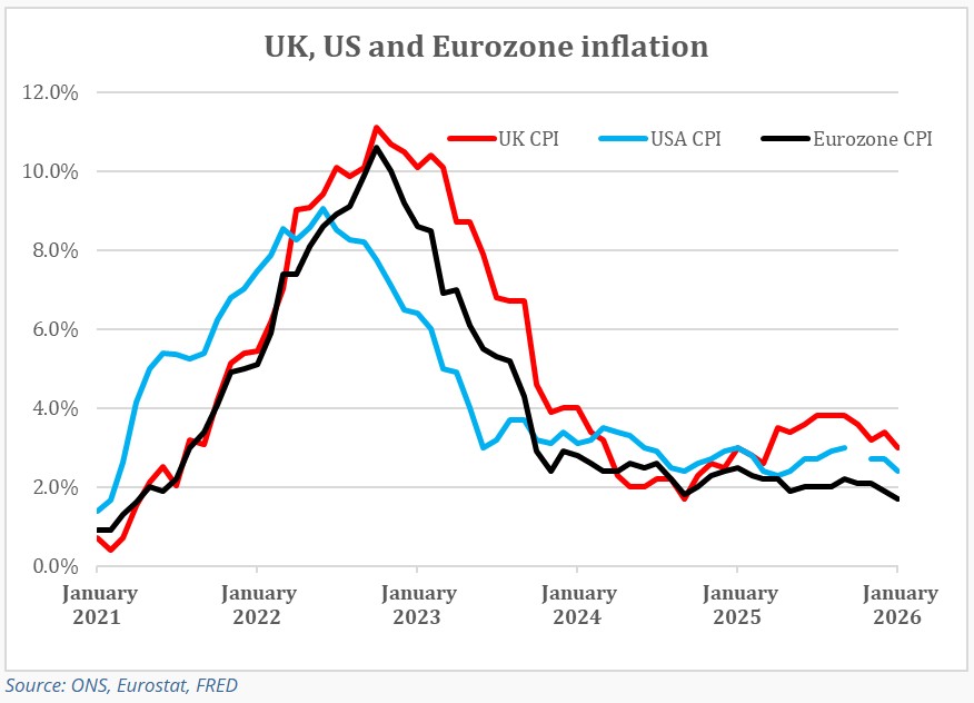 Annual CPI inflation for January 2026 was down 0.4% from the previous month at 3.0%. A fall was widely expected with the market consensus expectation being for a figure of around 3%. In its February Monetary Policy Committee Minutes the Bank of England said, “CPI inflation was expected to fall back to around the 2% target from April. This mainly reflected developments in energy prices, including the impact of measures announced in Budget 2025.” This month, the Bank had projected a 2.9% reading for January 2026.