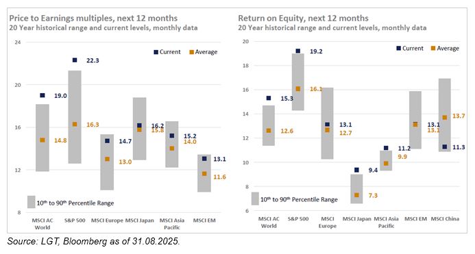 1. Earnings quality – you get what you pay for. Though US valuations do look lofty, earnings have backed up rising prices. And these two are not disconnected. The chart above shows the underlying earnings picture remains strong, and there are regions delivering genuine earnings growth. It also shows that many markets currently have high price-to-earnings multiples relative to their historical averages, but this is justified by higher-than-average return-on-equity.[1] So, while current valuations are elevated, so too are earnings and returns, suggesting that you are paying for quality. Our investment committee are keeping a close eye for any changes to this dynamic and we have recently downgraded our Valuation score of US equities within our Fundamentals, Valuations and Technicals (FVT) asset class framework to reflect the recent performance.