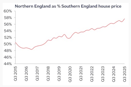 According to the Nationwide, London was the weakest performing region in the first nine months of the year with annual growth averaging 1.3%. This was part of a wider trend that saw house price growth in the northern regions of England outpacing the southern regions. As a result, the price differential narrowed to its lowest since 2013. The average price of a home in northern regions of England is now almost 58% of that in the southern regions, well above the lows of c48% seen in 2017.