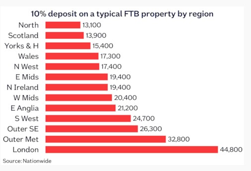 As mentioned above, the Nationwide found that a 10% deposit on a typical UK first-time buyer property is around £23,000, and that, even based on saving 10% of average net pay (c. £320) per month, it would take a prospective buyer nearly six years to accumulate this. However, it added. the level of deposit required also varies considerably by region, reflecting differences in average house prices. For example, a 10% deposit in London is over three times larger than the equivalent in the North (as illustrated below). It would also take a Londoner nine years to save for their deposit versus around four years for someone buying in the North, based on saving 10% of their average net pay.