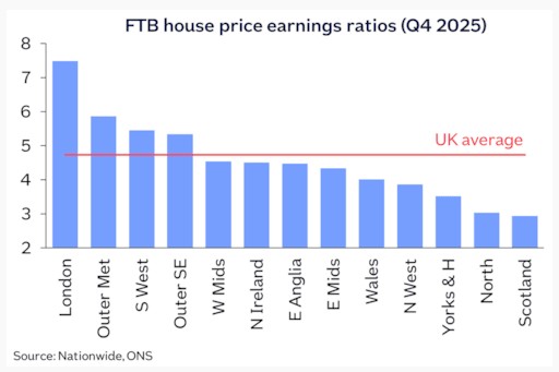 The Nationwide found that most regions have seen a slight improvement in their house price to earnings ratios relative to a year ago, with London continuing to have the highest house price to earnings ratio at 7.5 and Scotland the lowest at 2.9.