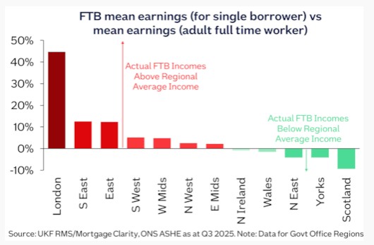 Mr Harvey’s concluding comments were that “London stands out as the area with the greatest divergence, with actual first-time buyer earnings (for a single borrower) around 45% higher than average incomes in the capital. But in regions where affordability is less stretched, such as the Midlands, actual first-time buyer earnings tend to be much closer to regional averages. And in a few areas, most notably Scotland, the incomes of actual first-time buyers are below the average income in the region, indicating relatively healthy housing affordability.”