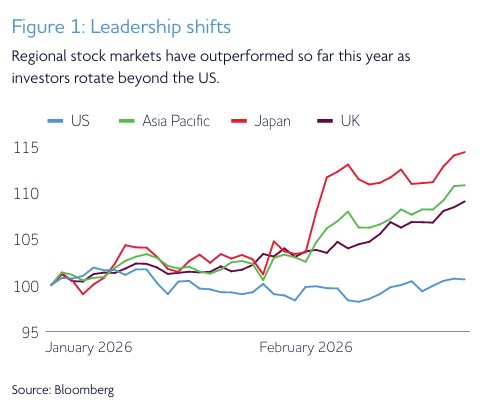 US stocks recovered after worries about the impact of artificial intelligence on company profits proved short-lived. Even so, market leadership has broadened, with investors rotating away from the US and into other regions year to date (figure 1). After a strong start to 2026, European equities climbed to record highs following a string of upbeat company results. Japanese stocks also broke records after Prime Minister Sanae Takaichi secured a decisive election victory, clearing the way for increased spending and tax cuts.
